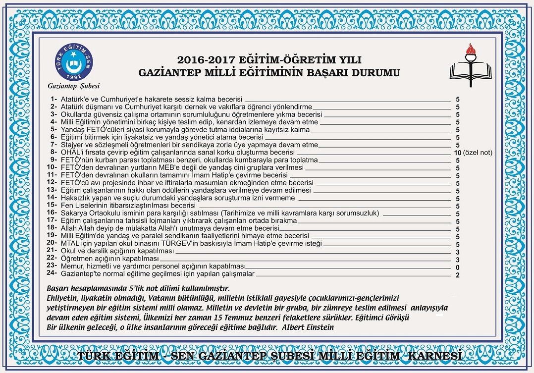 Eğitim-öğretim yılının sonuna geldiğimiz bu günlerde geriye dönüp baktığımızda, eğitim çalışanları olarak hiç yaşamak istemediğimiz bir yıl oldu 2016-2017 eğitim-öğretim yılı. Bu yılda eğitim çalışanları ve Türkiye’de yaşayan herkes adeta korku tüneline alınıp sürekli korkutuldu. Ülkemizde suç işleyenler, Devletimize ve milletimize kast edenler, darbeciler, vatan hainleri korksun elbette. Suç işleyenler cezalarını da çeksinler elbette. Ancak, Türkiye Cumhuriyeti Devletimize sadakat bağıyla bağlı, vatanına, milletine hizmet etmeyi şeref bilen eğitim çalışanları ve öğretmenler neden korksun? Oluşturulan korku iklimi, suçlu ile suçsuzun birbirinden ayrılamaması, bir çok öğretmeni, çok sevdiği mesleğinden ayrı kalmak zorunda bıraktı. Bir çok öğretmen de suçu olmadığı halde günlerce gözaltında tutuldu. Suçu olmadığı halde bu tür uygulamalara maruz kalan eğitim çalışanlarının itibarları yerle bir edildi. Bu manzarayı gören eğitim çalışanları ve öğretmenler panik içerisinde görevlerini yaptılar. Kısacası bu eğitim-öğretim yılı korkuların kaygıların yaşandığı bir yıl oldu.