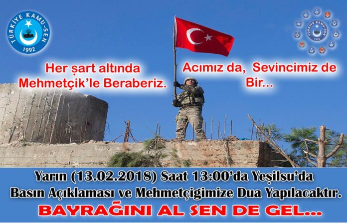 13 Şubat 2018 Salı günü Yeşilsy’da saat 13:00’da yapılacak basın açıklaması ve mehmetçiğimize dularda sizleri aramızda görmek isteriz.