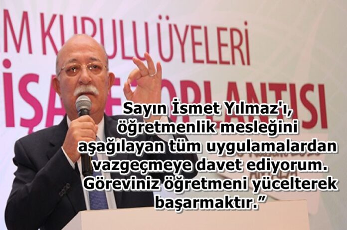 Sayın İsmet Yılmaz’ı, öğretmenlik mesleğini aşağılayan tüm uygulamalardan vazgeçmeye davet ediyorum. Göreviniz öğretmeni yücelterek başarmaktır.”