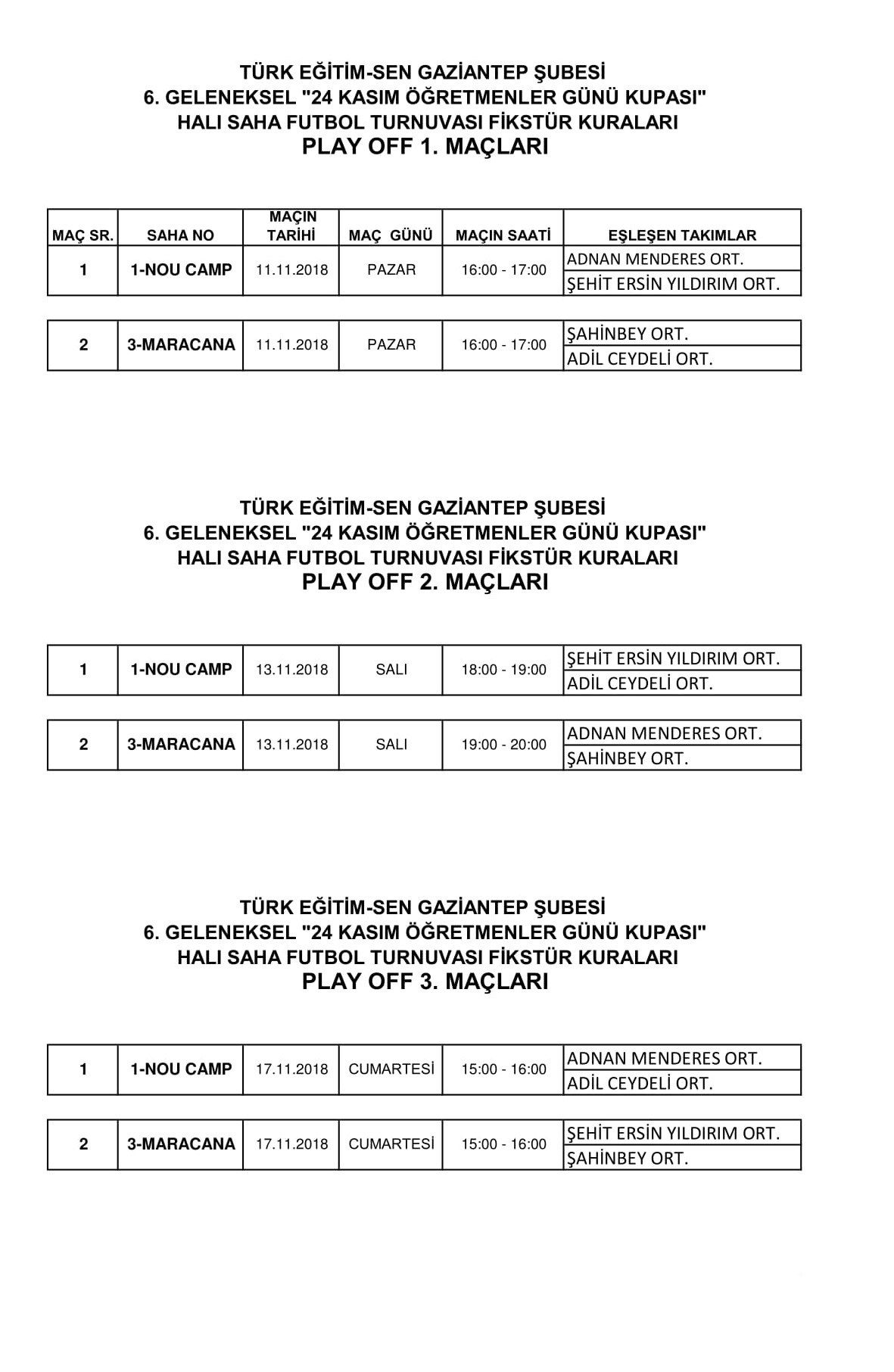 Türk Eğitim-Sen Gaziantep Şubesi 6. Geleneksel 24 Kasım Öğretmenler Günü Kupası Halı Saha Futbol Turnuvasında Çeyrek final maçları sonrasında yarı finale kalan takımlar belli oldu. Çeyrek final maç sonuçları şöyledir: